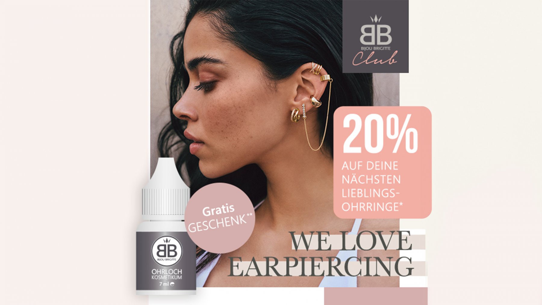Wenn du dir vom 01.03.-15.03.2026 ein Ohrloch bei Bijou Brigitte stechen lässt, erhältst du zusätzlich zu dem 20 % Rabatt auf deine nächsten Lieblingsohrringe* als BB-Club Member ein Ohrlochkosmetikum** zur Pflege der neuen Ohrlöcher.
