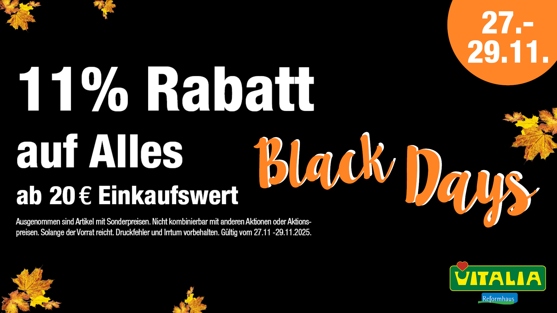 Nutzen Sie unsere Black Days und decken Sie sich jetzt mit Ihren Lieblingsprodukten besonders günstig ein. Ob stärkende Naturarznei, verwöhnende Naturkosmetik oder leckere Bio Lebensmittel – bei uns werden Sie bestimmt fündig. Denken Sie jetzt schon an Weihnachten und die Adventszeit und sichern Sie sich Geschenke für Weihnachten, Nikolaus und den Adventskalender zum Aktionspreis.
