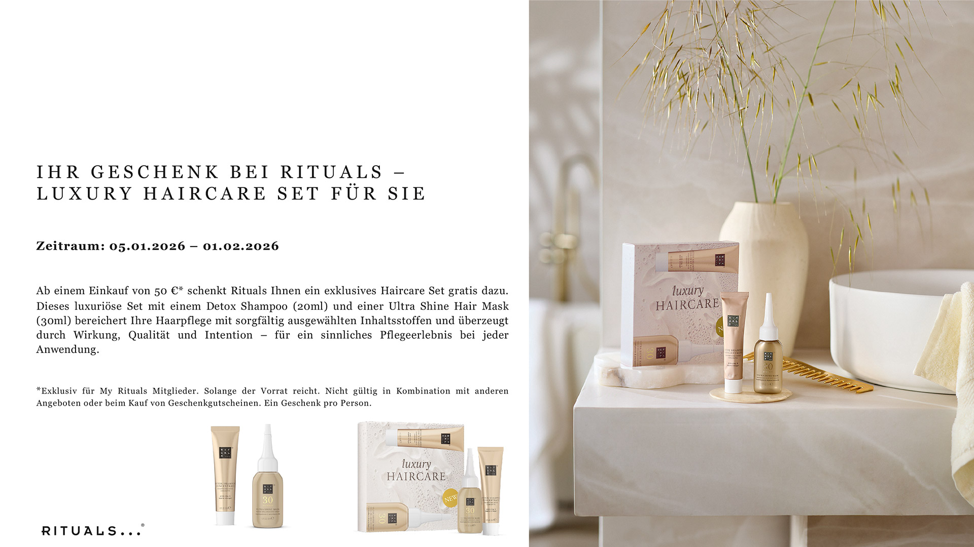 Ab einem Einkauf von 50 €* schenkt Rituals Ihnen ein exklusives Haircare Set gratis dazu. Dieses luxuriöse Set mit einem Detox Shampoo (20ml) und einer Ultra Shine Hair Mask (30ml) bereichert Ihre Haarpflege mit sorgfältig ausgewählten Inhaltsstoffen und überzeugt durch Wirkung, Qualität und Intention – für ein sinnliches Pflegeerlebnis bei jeder Anwendung.