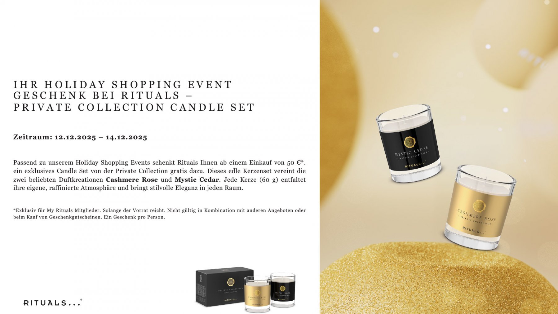 Passend zu unserem Holiday Shopping Events schenkt Rituals Ihnen ab einem Einkauf von 50 €* ein exklusives Candle Set von der Private Collection gratis dazu. Dieses edle Kerzenset vereint die zwei beliebten Duftkreationen Cashmere Rose und Mystic Cedar. Jede Kerze (60 g) entfaltet ihre eigene, raffinierte Atmosphäre und bringt stilvolle Eleganz in jeden Raum.