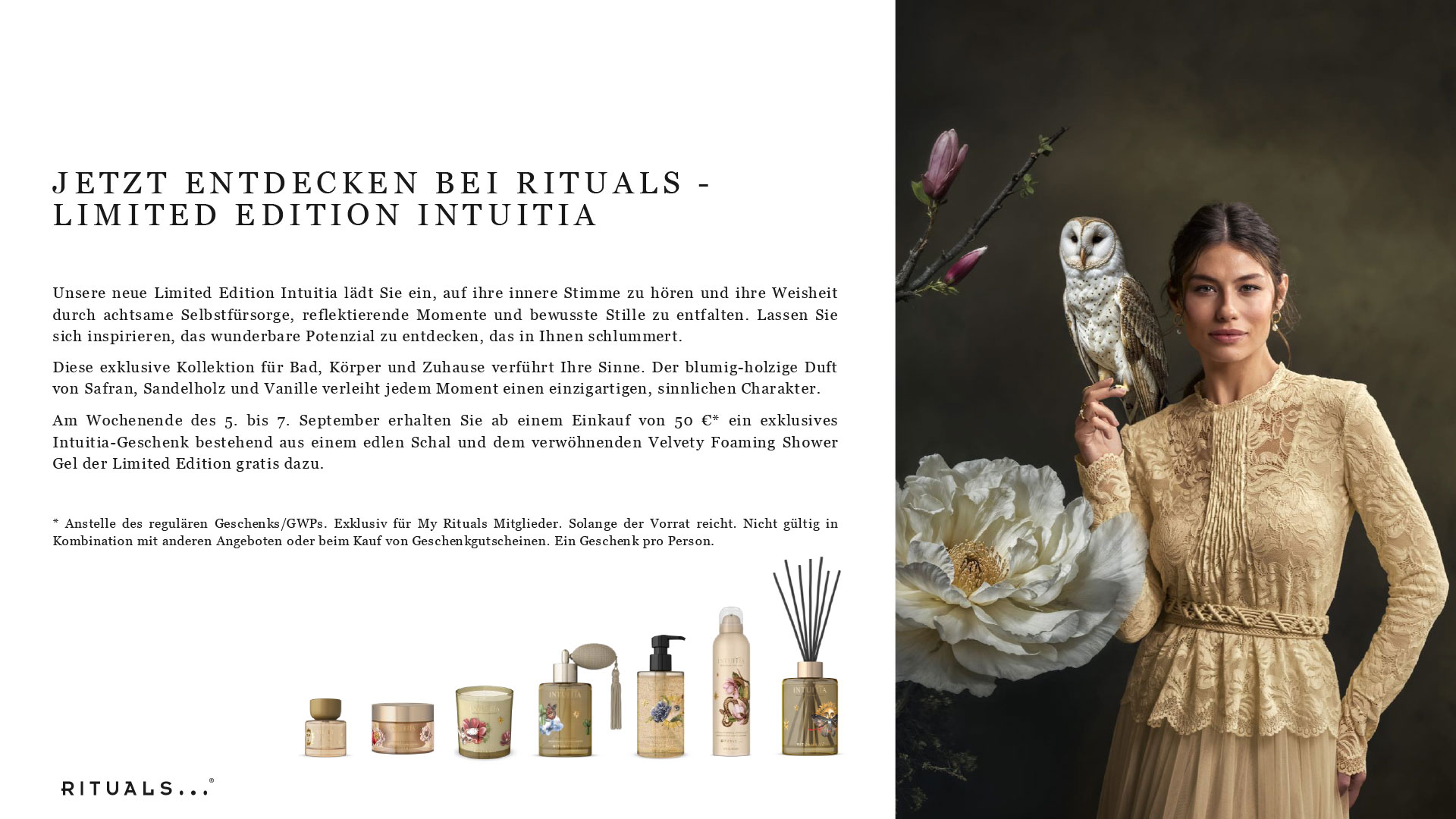 Unsere neue Limited Edition Intuitia lädt Sie ein, auf ihre innere Stimme zu hören. Diese exklusive Kollektion für Bad, Körper und Zuhause verführt Ihre Sinne. Der blumig-holzige Duft von Safran, Sandelholz und Vanille verleiht jedem Moment einen einzigartigen, sinnlichen Charakter. Am Wochenende des 5. bis 7. September erhalten Sie ab einem Einkauf von 50 €* ein exklusives Intuitia-Geschenk bestehend aus einem edlen Schal und dem verwöhnenden Velvety Foaming Shower Gel der Limited Edition gratis dazu.