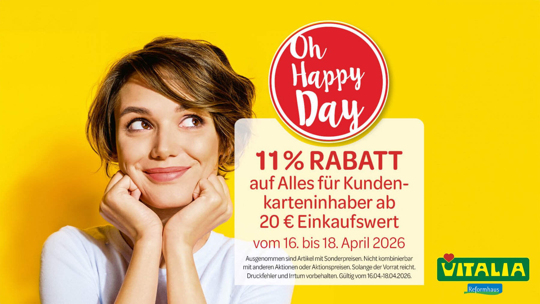 An unserem Oh Happy Day erhalten Sie mit der VITALIA Kundenkarte 11% Rabatt auf Alles ab 20€ Einkaufswert.
