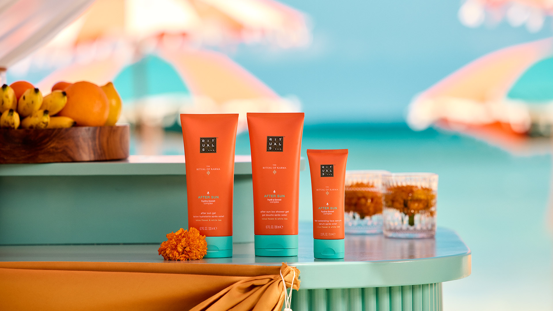 Entdecken Sie die neuen Sonnenpflege und Selbstbräunungs Produkte von The Rituals of Karma. Freuen Sie sich auf innovative Formate, fortschrittliche Formulierungen mit pflegenden Inhaltsstoffen und einem sommerlichen Duft.