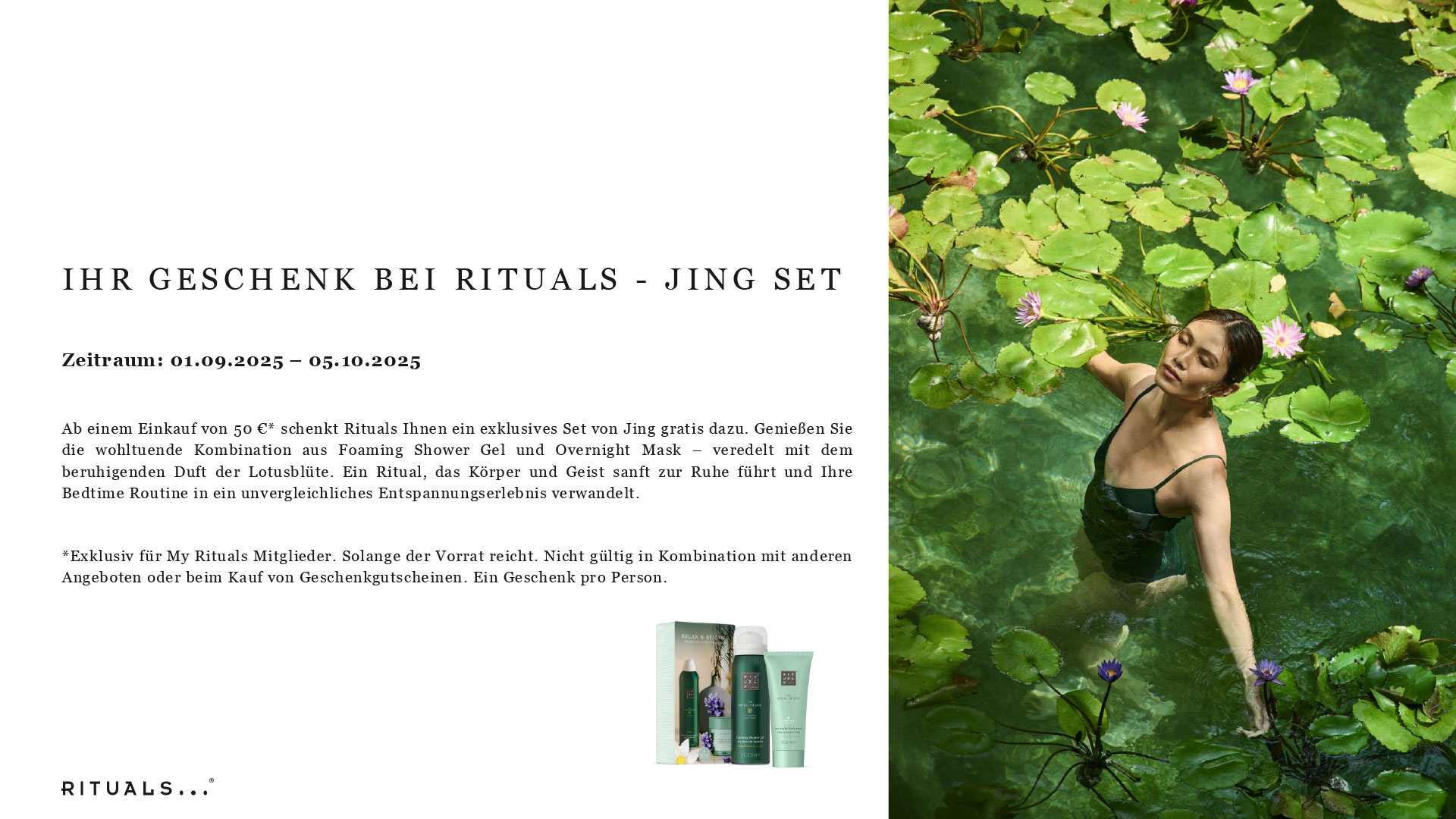 Ab einem Einkauf von 50 €* schenkt Rituals Ihnen ein exklusives Set von Jing gratis dazu. Genießen Sie die wohltuende Kombination aus Foaming Shower Gel und Overnight Mask.