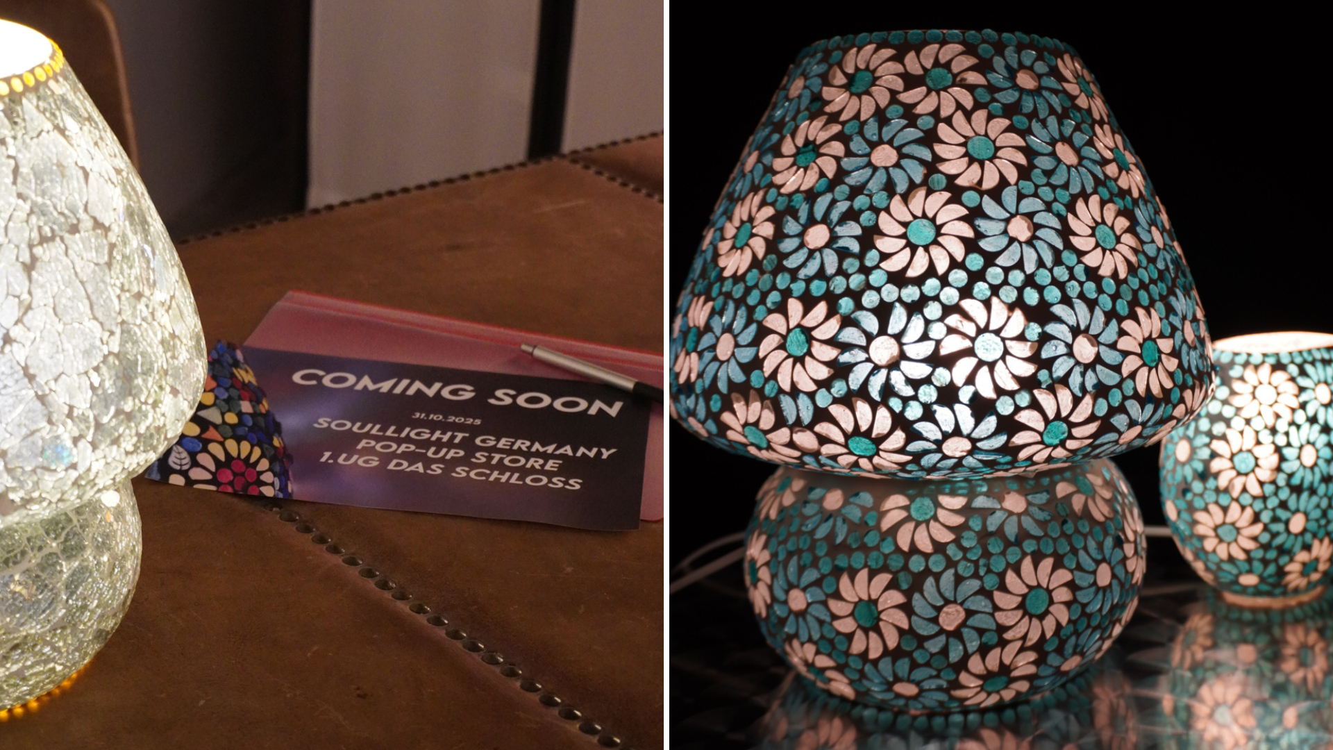 Bereits jetzt können sie die wunderschönen handgefertigten Mosaiklampen in unserem Showroom im 1. OG im Einkaufszentrum „Das Schloss“ anschauen. Unser Onlineshop wird kurzfristig unter soulligthgermany.de für sie erreichbar sein.